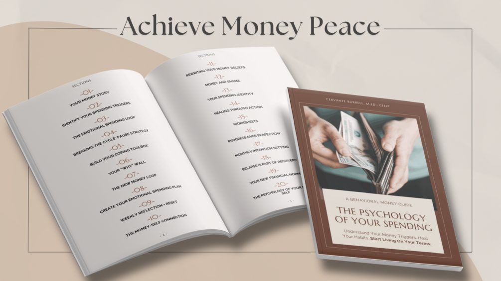 Created by Cervante Burrell, M.Ed., CFEI®, this behavioral money workbook walks you step-by-step through your past experiences, emotional triggers, and subconscious beliefs that drive emotional spending. It helps you understand your “why”, so you can rewrite your money story with compassion, clarity, and control.